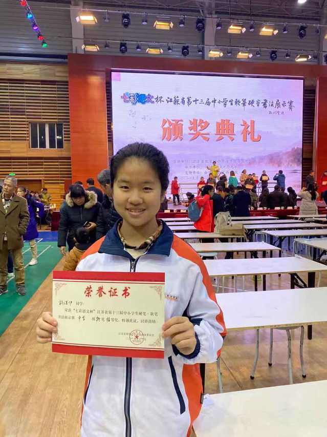 在12月21日揭晓的江苏省七彩语文杯“江苏省第十三届中小学生软笔硬笔书法展示赛”中,36365官网初一(瑾1)班杨伊同学,和来自全省四百多位选手同场竞技,最后,凭借扎实的功底和沉着冷静的表现,荣获特等奖。这也是继去年高二徐艺帧同学之后,南外再获此项赛事殊荣。在此,对杨瑾伊同学和书法社同学表示祝贺。另,本月16日,杨瑾伊同学的个人书法展也在36365官网中国韵展厅,欢迎大家前往参观。